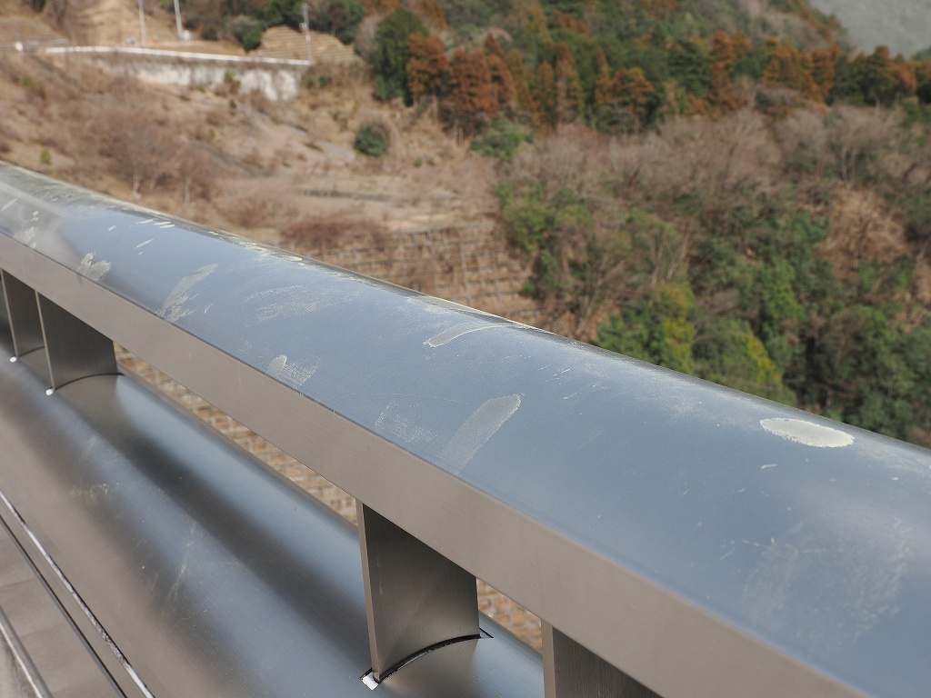 手すりの手のあとに花粉がたくさん